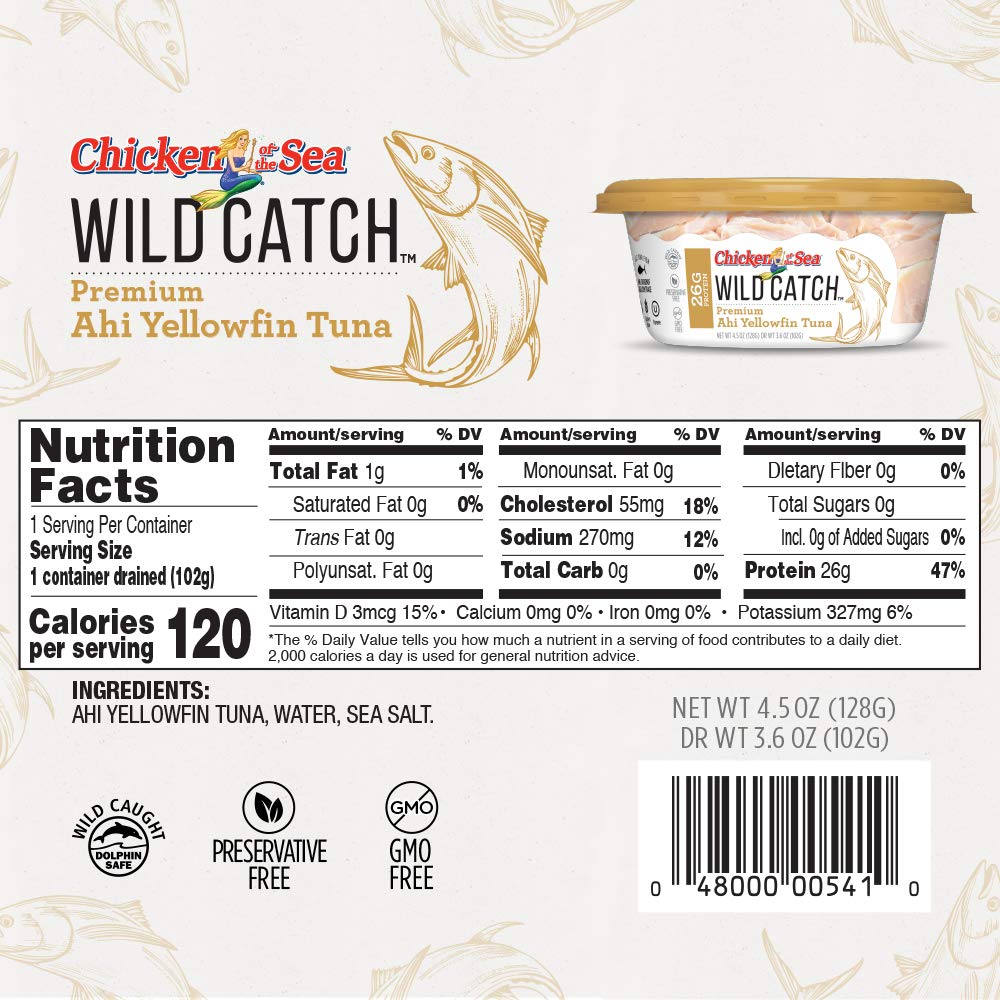 Wild Catch Premium Ahi Yellowfin Tuna by Chicken of the Sea is part of a new line of premium responsibly wild-caught seafood. With 26 grams of protein per container adding this tuna. 100 natural and made with 3 simple ingredients.